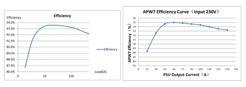 Below are charts of several Bitmain PSU’s AC to DC conversion efficiency at various power levels. The general shape of this curve holds for almost all voltage conversion methods. There is a sweet spot that is actually somewhat below the designed operating current. Reducing hashrate actually raises PSU efficiency, to a point. Conversely, increasing hashrate reduces PSU efficiency, and is likely the primary reason that miners assume that overclocking reduces J/TH efficiency.
