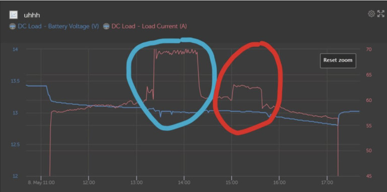 Perhaps the most difficult scenario though is with a very underpowered system. When the sun comes up and pushes voltage high enough to trigger the relay and turn on your miner, it will immediately start burning more power than is being produced. The difference comes from the battery. All batteries sag in voltage when power is drawn out. The amount of voltage sag depends on the size of the power draw relative to the size (in AH-amp hours) of the battery bank. On my 800AH system voltage can sage as much as 1V if I’m pulling 150-200A from the batteries. This means that the hashboards must now run at 12.2V instead of 13.2V or 14.2V. Underclocking will reduce the power draw on the batteries, helping them to last longer. But, this also increases system voltage, decreasing my j/TH and Amps/TH efficiency. Even a large battery bank is unlikely to last more than a few hours.