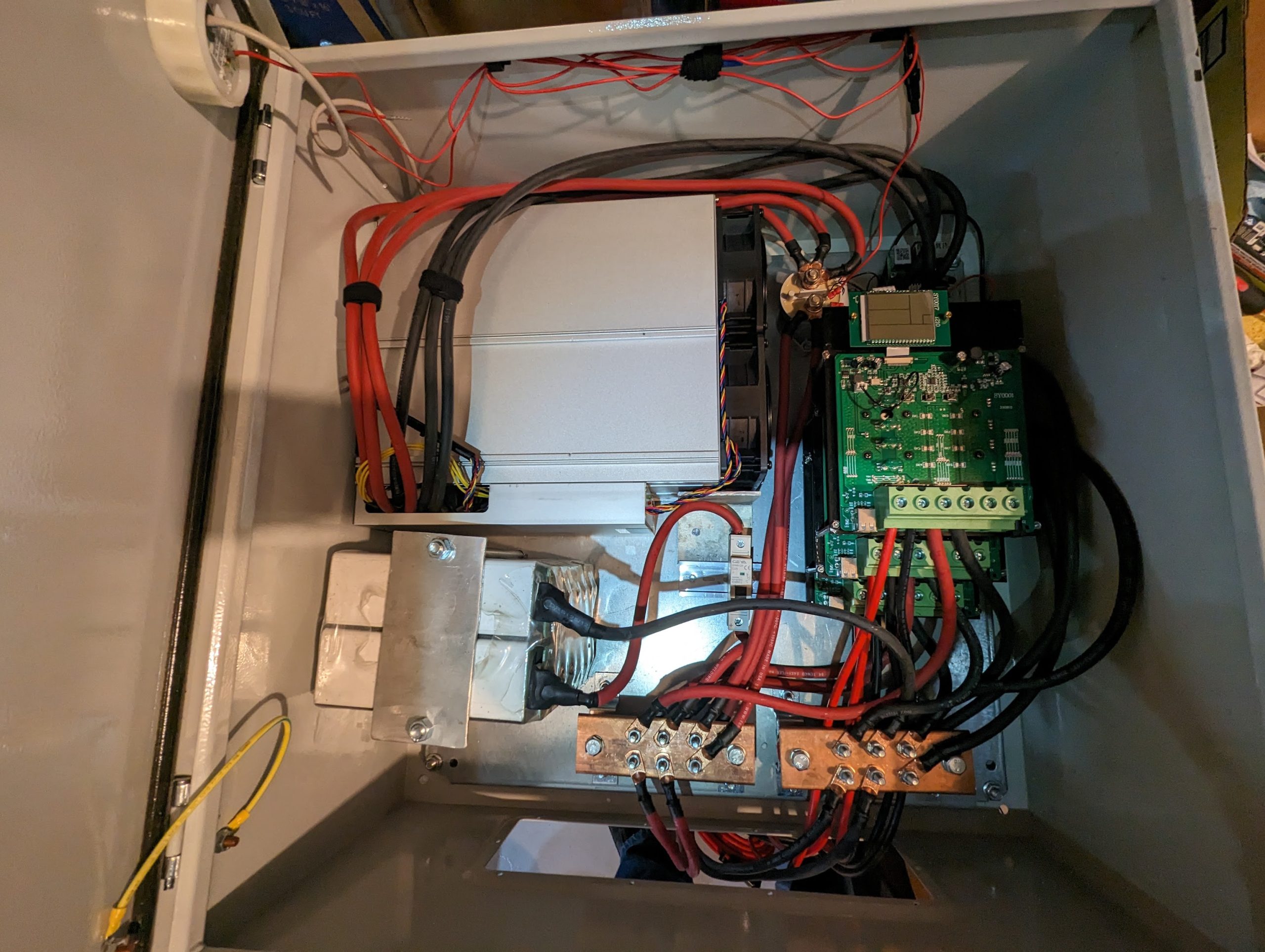 I would be remiss if I started an Ungovernable Misfits article without the requisite appeal to safety. Seriously, high current DC power is no joke. There are reasons no one builds large solar installations this way. The risk profile and failure modes are entirely different than a high voltage low current system. In the latter, you are more concerned with good insulation, and short circuits causing tripped circuit breakers. In this low voltage regime, connection failure typically results in melted or vaporized copper starting fires. You can have a bad connection overheat and vaporize without ever tripping a breaker. In a typical mining server, the low voltage high current of 200+ amps travels through two connection points and about one to three inches of solid copper bar. In this build, we are pushing 300-400 amps potentially thirty feet or more through at least 8 connections. Each one presents a possibility of failure, especially after repeated thermal cycling. It can be done, and it can be done safely. But it requires a LOT of copper and good solid high quality connection points. I have found that periodically inspecting with a thermal camera is useful as well. In the following picture, the “hot” wires were in fact only barely above room temperature. So it’s good to “calibrate” what you see in the picture by getting hands on a few things. But this method should make any dangerously hot connections easy to spot.