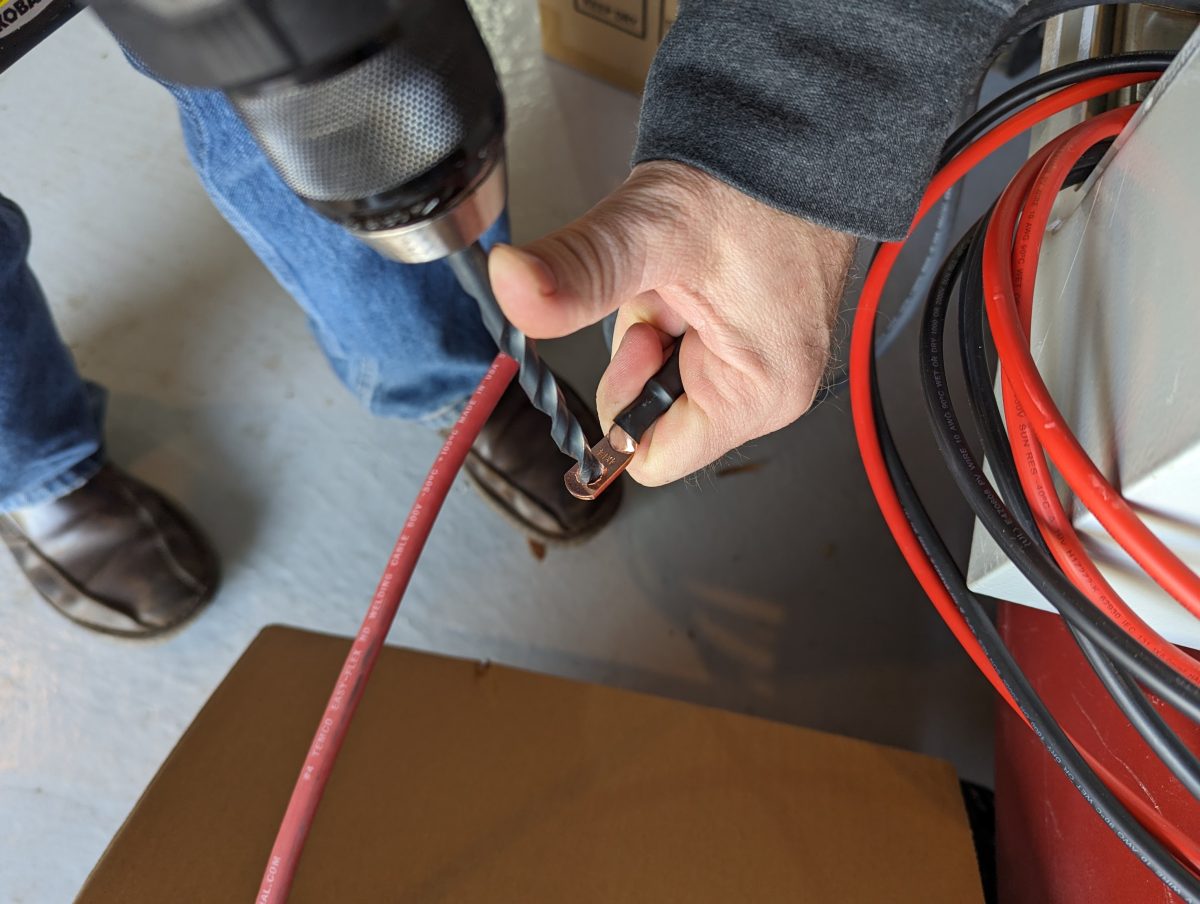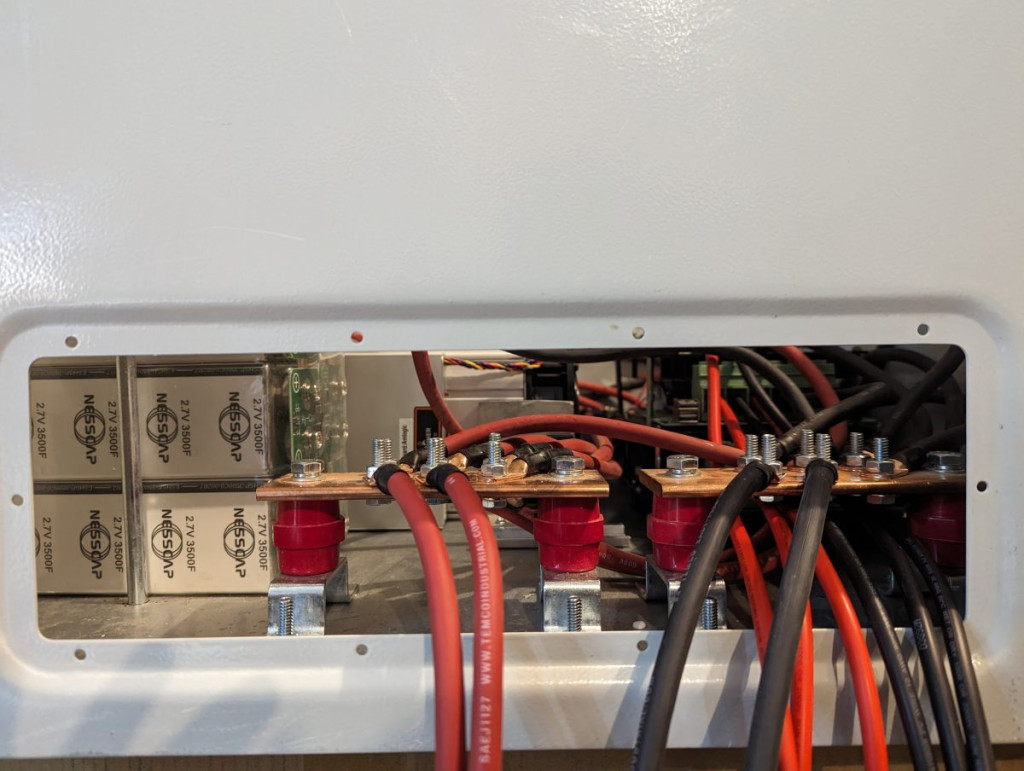 I understand the price has dropped to $1800 recently as more orders have enabled better relationships with parts suppliers. The box consists primarily of a large metal utility box, a monstrous supercapacitor, four 100A charge controllers (to take in the power from the panels), a relay to power on/off the miner, a large copper power bus, and a Raspberry Pi which is running the 100 Acres Ranch proprietary algorithm to control miner hashrate according to the system’s available power and voltage. He also includes a couple exhaust shroud options for ducting the heat in case you are reusing that (you should!). It also includes two sets of 4/0 AWG wires for the batteries with high quality hydraulically crimped end connectors.