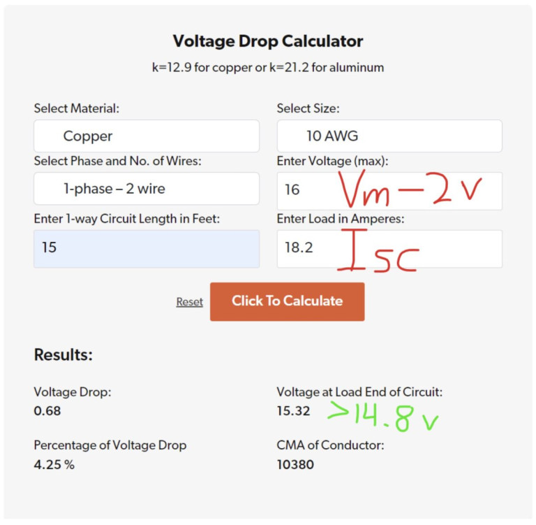 Calculating voltage drop is a very important part of sizing your cables and designing your system layout. I use the calculator here, but there are many. The entry “Voltage (max)” is the voltage applied to the wire at the panel end. As a rule of thumb, enter your panel’s maximum power point voltage (Vmp) minus 2V. This accounts for about 10% drop in Vmp if the panel is really hot from baking in the sun. To be more precise, typical Voc temperature coefficients are around -0.25% / degree C. Panels in the sun can get 40 degrees C over ambient, especially with no wind.