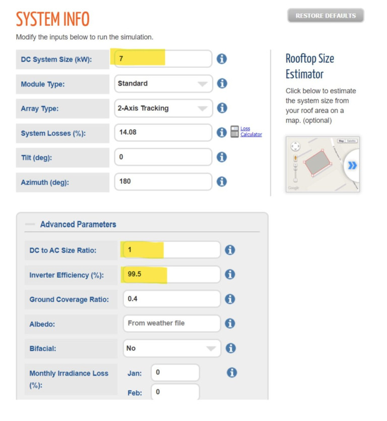 First, under “Advanced Parameters: DC to AC Size Ratio” enter 1, instead of the default value of 1.2. Solar inverters are expensive, and fixed systems only briefly produce full power in the middle of the day. Consequently, inverters are typically undersized compared to the total power rating of the panels. This is called “inverter clipping”. “For a system with a high DC to AC size ratio, for times when the array’s DC power output exceeds the inverter’s rated DC input power, the inverter limits the array’s power output by increasing the DC operating voltage, which moves the array’s operating point down its current-voltage (I-V) curve. PVWatts® models this effect by limiting the inverter\’s power output to its rated AC size.” (NREL). Since we don’t have an inverter on this system, we can pretend that our “inverter” is huge and turns every possible Watt into useful power. You can also set “Inverter Efficiency” here to 99.5% (highest option) since we don’t have an inverter.