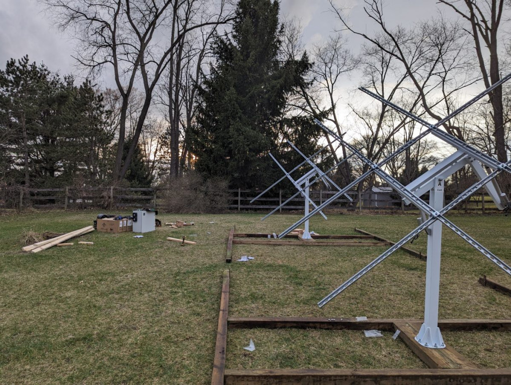 As you can see in the title picture, I opted to build “rockjacks” to mount the trackers onto. This is DEFINITELY not recommended or supported by the manufacturer. The directions specify a poured concrete pad. I wanted the system to be mobile, as there are some trees at my location which will be coming down soon and open up better location options. The rockjack frames are staked quite firmly. Time will tell whether they are staked down firmly enough.